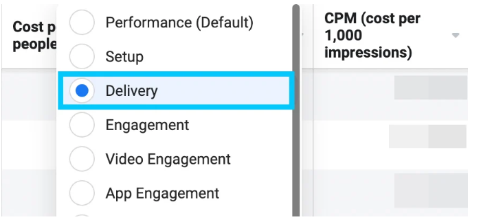 Để kiểm tra số liệu này, hãy mở Trình quản lý quảng cáo , chọn chiến dịch và chọn cài đặt trước “Phân phối” từ menu cột.