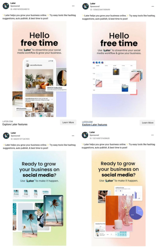 Ví dụ: bảng điều khiển lập lịch truyền thông xã hội Later đã thử nghiệm nhiều quảng cáo để thu hút khán giả.