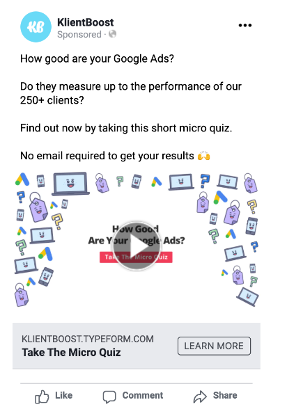 - Câu đố: Tạo biểu mẫu khách hàng tiềm năng có câu đố trên Facebook để thu thập thông tin chi tiết về khách hàng theo cách tương tác và thú vị. Tại KlientBoost, chúng tôi từng tạo một bài kiểm tra để cho khách hàng tiềm năng thấy dịch vụ của chúng tôi có giá trị như thế nào.