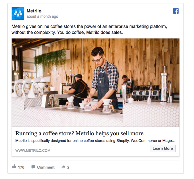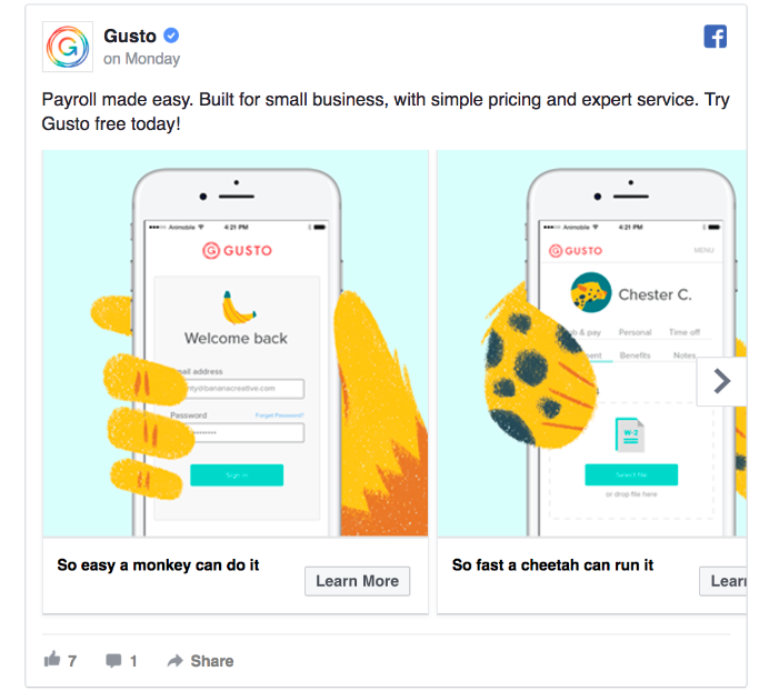 Đây là ví dụ về quảng cáo quay vòng trên Facebook của Gusto: