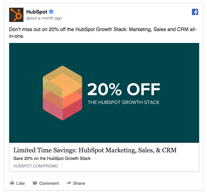 Ví dụ: HubSpot đã đưa ra mức giảm giá 20% trong thời gian giới hạn cho mức tăng trưởng của công ty. Toàn bộ quảng cáo dưới đây tập trung vào việc tạo ra sự cấp bách. Bản sao thậm chí còn bắt đầu bằng dòng chữ, “Đừng bỏ lỡ…”