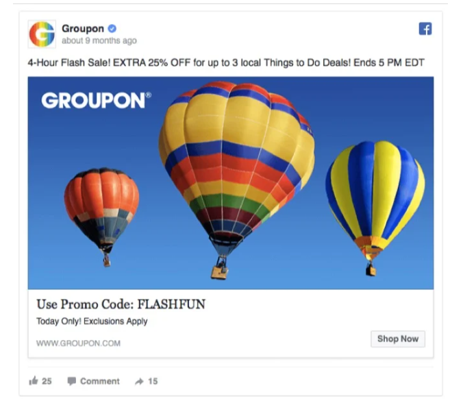 Đây là một ví dụ khác của Groupon. Quảng cáo này kết hợp nhiều thủ thuật với nhau để tạo ra lực hút nhấp chuột và bán hàng tối ưu.
