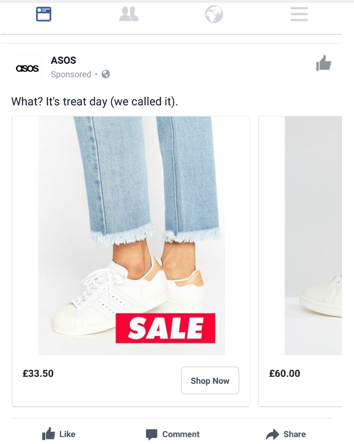Nói cách khác, hãy tìm CTA phù hợp với động lực của khán giả. Ví dụ: khi quảng cáo bán hàng trực tuyến, ASOS sử dụng nút CTA “Mua ngay”.