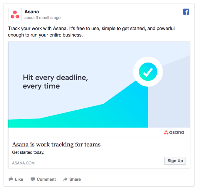 Để giúp quảng cáo Facebook của bạn dễ dàng được phát hiện hơn trong nguồn cấp dữ liệu, bạn có thể tạo quảng cáo có độ tương phản và nhiều màu sắc như Asana.