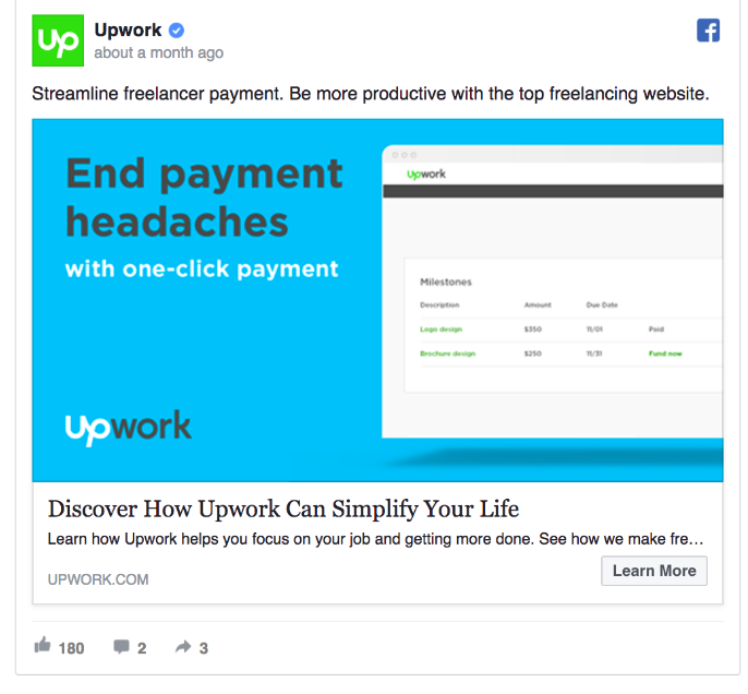 Quảng cáo trên Facebook của Upwork đưa ra lời đề nghị hấp dẫn trong hình ảnh quảng cáo: “Đau đầu khi thanh toán…”