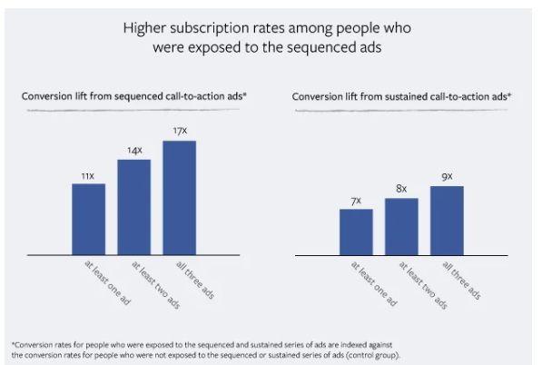 - Trong cùng thời gian, chiến dịch còn lại đưa ra các quảng cáo “theo trình tự” bắt đầu bằng câu chuyện thương hiệu, cung cấp thông tin sản phẩm và sau đó mời mọi người đăng ký vào cuối chu kỳ.