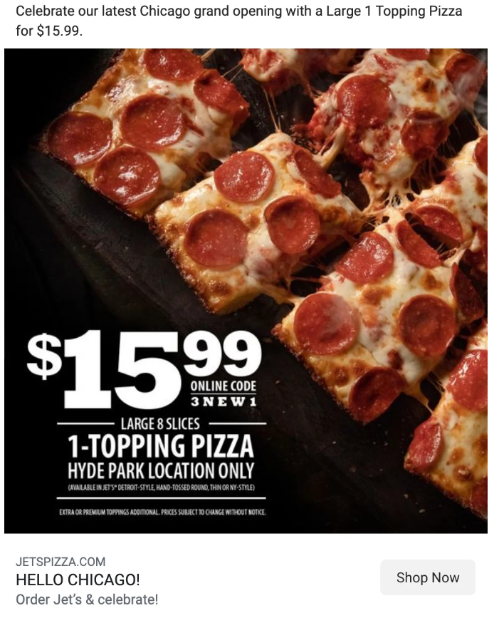 Ví dụ: quảng cáo Jet's Pizza bên dưới đề cập đến “Chicago” trong bản sao và “Hyde Park” trong quảng cáo để thu hút đối tượng mục tiêu.