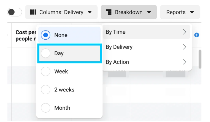 Để xem những ngày trong tuần nào đóng góp nhiều chuyển đổi nhất với CPA thấp nhất, hãy truy cập báo cáo Trình quản lý quảng cáo Facebook và sử dụng menu phân tích để xem chiến dịch của bạn theo ngày.