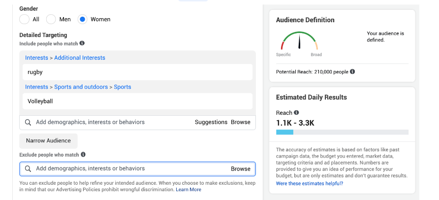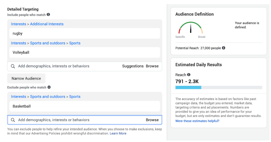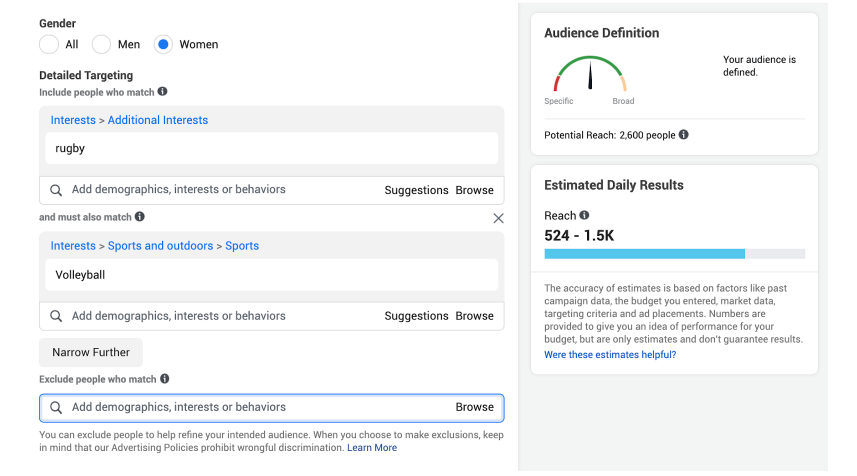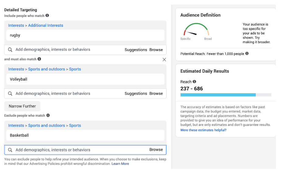 Thu hẹp đối tượng có thể cực kỳ hữu ích để tiếp cận đúng người, nhưng hãy chú ý đến quy mô đối tượng của bạn. Bạn không muốn thu hẹp lượng khán giả của mình thành một lượng khán giả quá nhỏ.