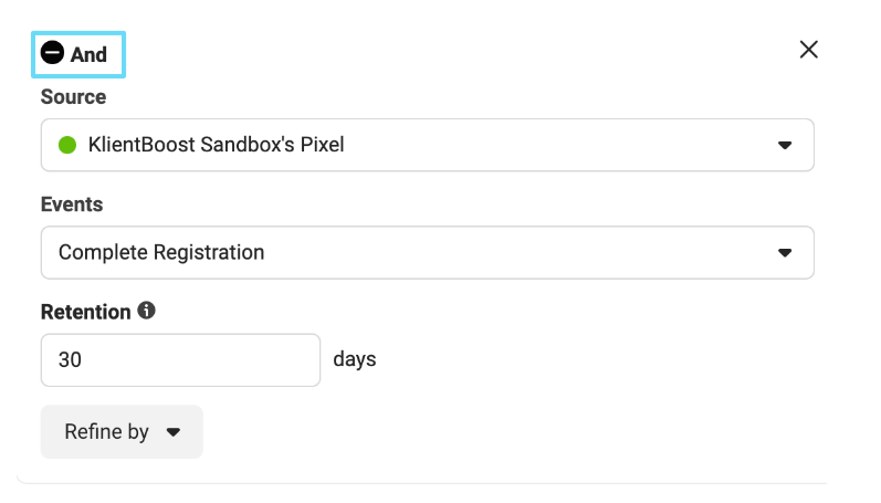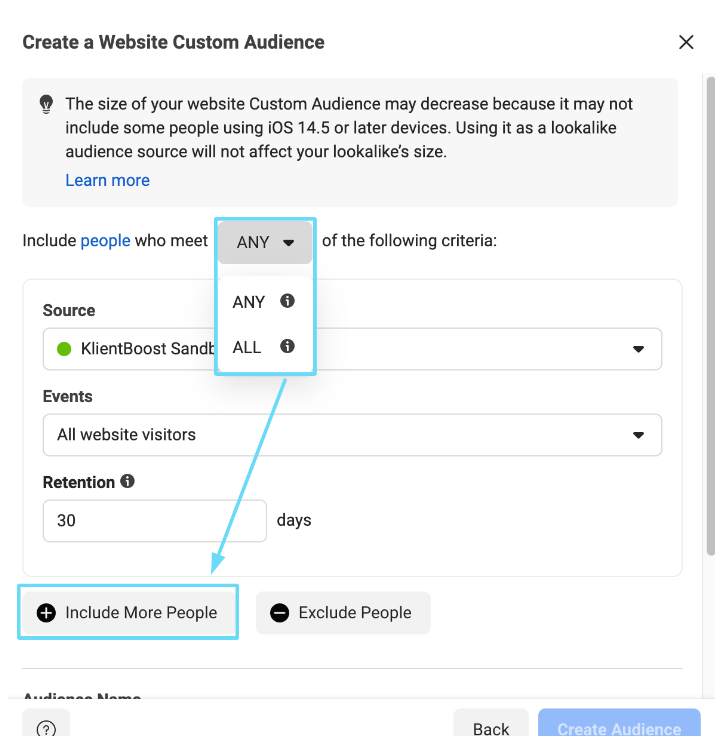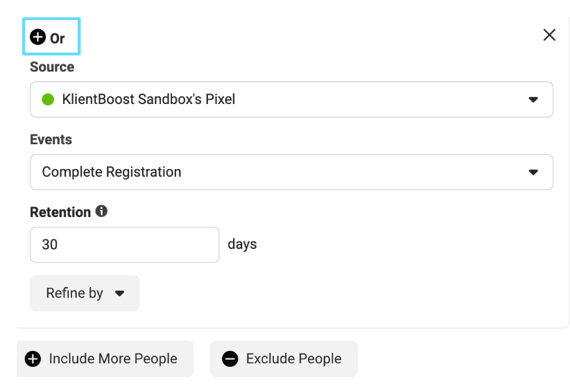 Ví dụ: giả sử tôi đang tạo đối tượng nhắm mục tiêu lại gồm những người đã truy cập trang định giá của tôi. Tôi chọn “bất kỳ”, sau đó nhấp vào “bao gồm nhiều người hơn” và chọn đối tượng thứ hai gồm những người đã hoàn tất đăng ký trên trang web của tôi.
