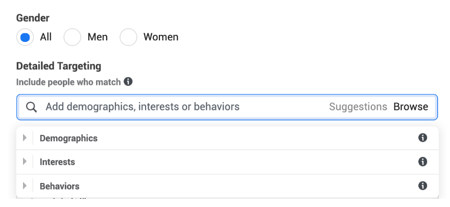Khi bạn tìm kiếm các tùy chọn nhắm mục tiêu trong phần nhắm mục tiêu chi tiết và thêm chúng lần lượt, đối tượng của bạn sẽ rộng hơn. Đây là nhắm mục tiêu “ bất kỳ ”, còn được gọi là nhắm mục tiêu “ hoặc ”, nghĩa là bạn bao gồm bất kỳ ai trong bất kỳ đối tượng nào bạn đã chọn.