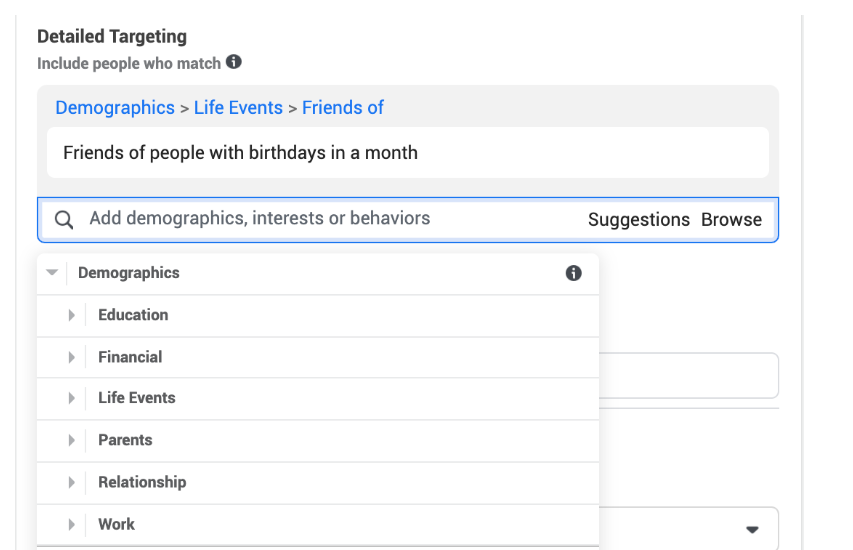Ví dụ: chỉ nhắm mục tiêu danh sách những người sắp đến ngày sinh nhật sẽ thu hút được lượng khán giả quá lớn và rộng. Những người trên đó có thể có bất kỳ sở thích hoặc khuynh hướng nào khi nói đến lễ hội sinh nhật của họ.