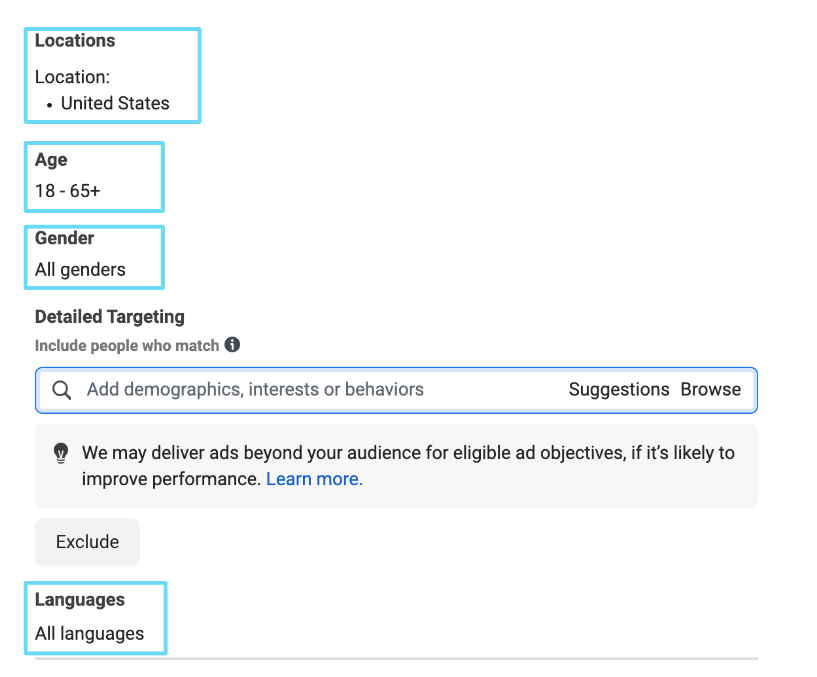 Loại trừ đối tượng khỏi nhắm mục tiêu của bạn có nghĩa là bạn không muốn những người thuộc đối tượng cụ thể đó nhìn thấy quảng cáo của bạn.