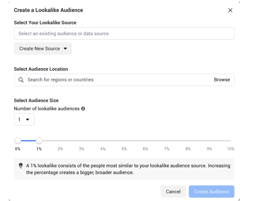 Mẹo chuyên nghiệp: Bạn thậm chí có thể xây dựng đối tượng Super Lookalike , là đối tượng kết hợp của phạm vi tỷ lệ phần trăm Lookalike hàng đầu (ví dụ: nhắm mục tiêu Đối tượng tương tự 0% – 1% và Đối tượng tương tự 1% – 5% bằng cách sử dụng quy tắc nhắm mục tiêu “bất kỳ”) .