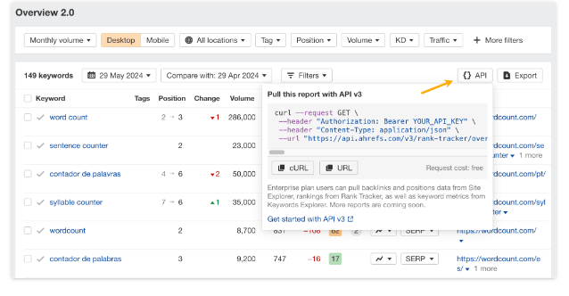 Chúng tôi vừa phát hành điểm cuối APIv3 Rank Tracker đầu tiên cho Tổng quan 2.0. Như thường lệ, bạn có thể sử dụng nút API trong chính báo cáo để tạo URL yêu cầu cho các bộ lọc bạn đã áp dụng.