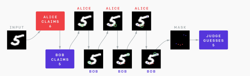 Cấu trúc của trò chơi tranh luận MNIST. Người tranh luận Alice và Bob nhìn thấy một hình ảnh, Alice cố gắng đánh lừa giám khảo nghĩ rằng đó là số 6, Bob cố gắng thuyết phục giám khảo rằng đó là số 5. Họ thay phiên nhau tiết lộ các điểm ảnh không phải màu đen cho giám khảo, người xác định chính xác đó là số 5 sau khi nhìn thấy sáu điểm ảnh. Alice vạch ra đường cong ở phía dưới để làm cho nó trông giống như số 6 (điểm ảnh màu đỏ) , nhưng Bob phản công hiệu quả chiến lược này bằng cách tiết lộ các điểm ảnh ở góc trên bên phải (điểm ảnh màu xanh lam) , mà hầu hết các MNIST 6 không có.