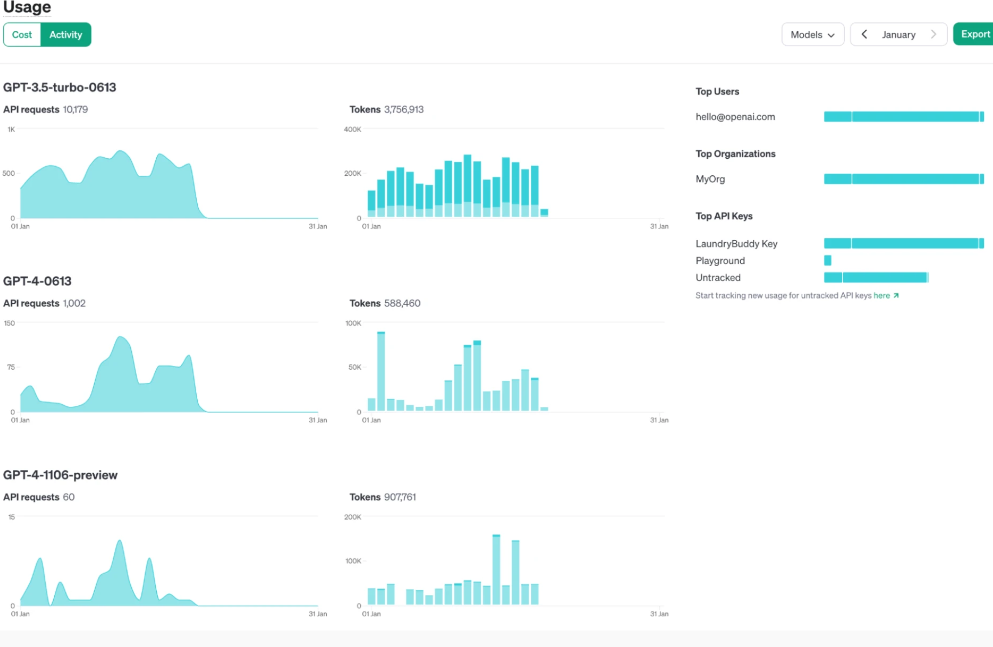 Thứ hai, bảng điều khiển sử dụng và chức năng xuất dữ liệu sử dụng hiện hiển thị số liệu ở cấp độ khóa API sau khi bật theo dõi (mở trong cửa sổ mới). Điều này giúp dễ dàng xem mức sử dụng theo từng tính năng, nhóm, sản phẩm hoặc dự án chỉ bằng cách có khóa API riêng cho từng tính năng, nhóm, sản phẩm hoặc dự án.
