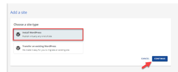 Từ đó, bạn có thể nhấp vào liên kết Cài đặt WordPress bên dưới Chọn loại trang web , sau đó nhấp vào Tiếp tục .