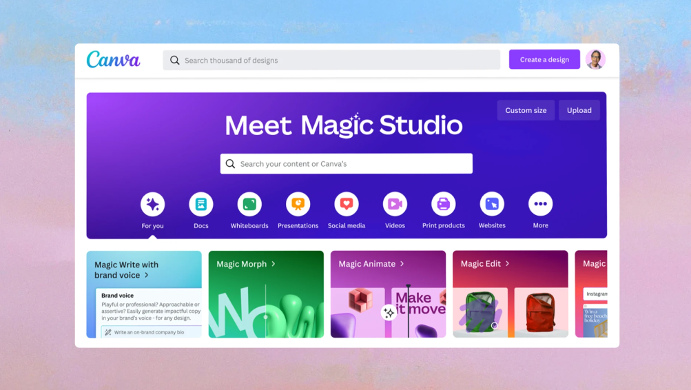 Canva tin rằng AI có thể biến đổi và đẩy nhanh quá trình sáng tạo, giúp thiết kế trực quan hơn và nhanh hơn cho mọi cấp độ kỹ năng. Để nhanh chóng đưa AI vào tay người dùng, Canva đã khai thác OpenAI làm mô hình nền tảng để phát triển một số công cụ cho bộ AI của mình, Magic Studio.