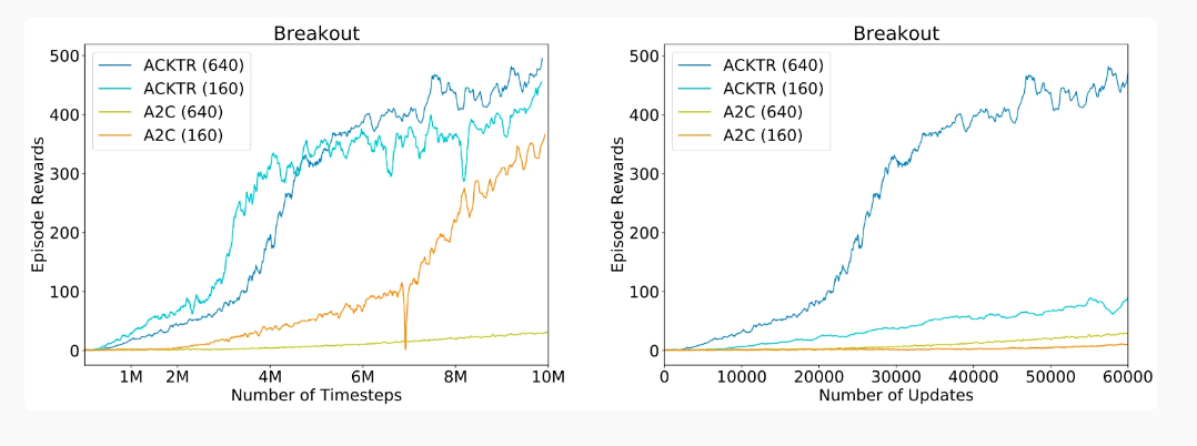 Chúng tôi cũng đang công bố các chuẩn mực(mở trong cửa sổ mới) đánh giá ACKTR so với A2C, PPO và ACER trên một loạt các tác vụ. Trong sơ đồ sau, chúng tôi trình bày hiệu suất của ACKTR trên 49 trò chơi Atari so với các thuật toán khác: A2C, PPO, ACER. Các siêu tham số của ACKTR được tác giả của ACKTR điều chỉnh chỉ trên một trò chơi, Breakout.