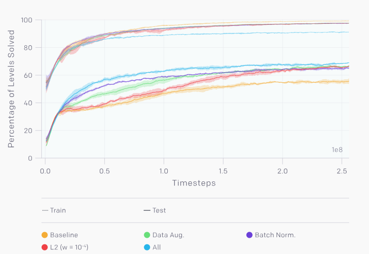 Chúng tôi đã thu thập từng điểm dữ liệu trong các biểu đồ sau bằng cách tính trung bình hiệu suất của tác nhân cuối cùng qua 10.000 tập. Vào thời điểm thử nghiệm, tác nhân được đánh giá ở các cấp độ chưa từng thấy trước đây. Chúng tôi phát hiện ra rằng hiện tượng quá khớp đáng kể xảy ra khi có ít hơn 4.000 cấp độ đào tạo. Trên thực tế, chúng tôi vẫn thấy hiện tượng quá khớp ngay cả với 16.000 cấp độ đào tạo! Không có gì ngạc nhiên khi các tác nhân được đào tạo với tập hợp các cấp độ không bị hạn chế thực hiện tốt nhất vì các tác nhân này có quyền truy cập vào nhiều dữ liệu nhất. Các tác nhân này được biểu diễn bằng đường chấm trong các biểu đồ sau.
