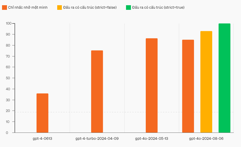 Với Structured Outputs, gpt-4o-2024-08-06đạt được độ tin cậy 100% trong các đánh giá của chúng tôi, hoàn toàn khớp với các lược đồ đầu ra.
