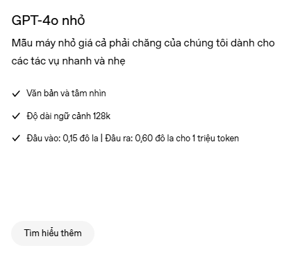 Chi Phí Sử Dụng Thấp Hơn: Với GPT-4o Nhỏ, doanh nghiệp có thể tiết kiệm đáng kể chi phí so với việc sử dụng các phiên bản AI lớn hơn mà vẫn đáp ứng được hầu hết nhu cầu.