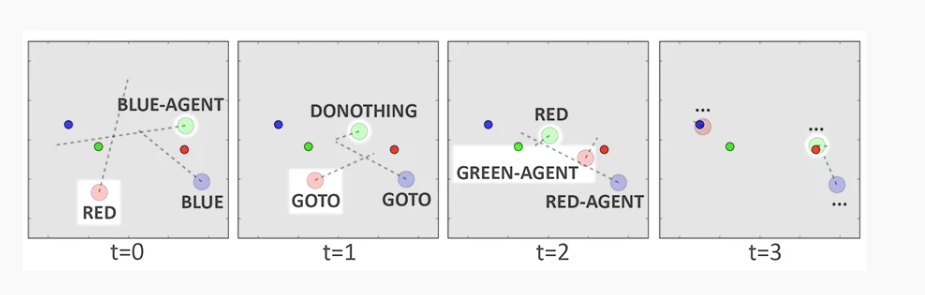 At each time step, our RL agents can take two kinds of actions—(i) environment actions, like moving around or looking at things, and (ii) communication actions, like broadcasting a word to all other agents. (Note that though the agents come up with words that we found to correspond to objects and other agents, as well as actions like “Look at” or “Go to,” to the agents these words are abstract symbols represented by one-hot vector—chúng tôi dán nhãn các vectơ one-hot này bằng các từ tiếng Anh để nắm bắt ý nghĩa của chúng vì mục đích diễn giải.) Trước khi một tác nhân thực hiện một hành động, nó sẽ quan sát các thông tin liên lạc từ các tác nhân khác từ bước thời gian trước đó cũng như vị trí của tất cả các thực thể và đối tượng trên thế giới. Nó lưu trữ thông tin liên lạc đó trong một mạng nơ-ron hồi quy riêng tư, cung cấp cho nó bộ nhớ về các từ mà nó nghe được.