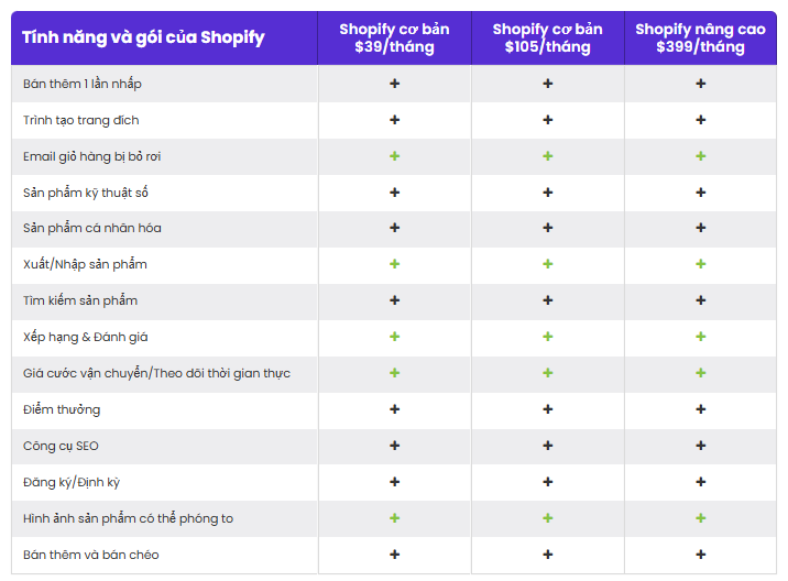 Để một sản phẩm có giá trị, nó cần có các công cụ và tính năng cho phép doanh nghiệp trực tuyến của bạn phát triển và mở rộng hiệu quả. Đó là lý do tại sao điều quan trọng là phải chú ý đến các tính năng mà mỗi gói cung cấp để bạn biết khi nào cần nâng cấp khi bạn mở rộng giá Shopify.