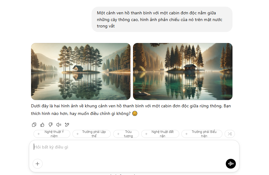 Hãy xem xét điều này: "Một cảnh ven hồ thanh bình với một cabin đơn độc nằm giữa những cây thông cao, hình ảnh phản chiếu của nó trên mặt nước trong vắt." Các chi tiết vẽ nên một bức tranh sống động, hướng dẫn AI kết xuất một hình ảnh cụ thể.