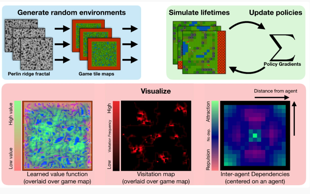 Chúng tôi hình dung sự phụ thuộc giữa các tác nhân-tác nhân bằng cách cố định một tác nhân ở trung tâm của một bản đồ cắt giả định. Đối với mỗi vị trí mà tác nhân đó có thể nhìn thấy, chúng tôi sẽ hiển thị hàm giá trị sẽ là gì nếu có một tác nhân thứ hai ở vị trí đó. Chúng tôi thấy rằng các tác nhân học các chính sách phụ thuộc vào các tác nhân khác, trong cả môi trường kiếm ăn và chiến đấu. Các tác nhân học các bản đồ tránh "mắt bò" để bắt đầu kiếm ăn hiệu quả hơn chỉ sau vài phút đào tạo. Khi các tác nhân học được cơ chế chiến đấu của môi trường, chúng bắt đầu đánh giá đúng phạm vi giao tranh hiệu quả và góc tiếp cận.