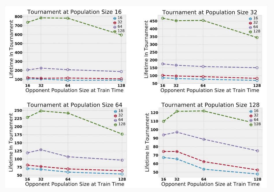 Chính sách của các tác nhân được lấy mẫu thống nhất từ một số quần thể—các tác nhân trong các quần thể khác nhau chia sẻ kiến trúc, nhưng chỉ các tác nhân trong cùng một quần thể mới chia sẻ trọng số. Các thí nghiệm ban đầu cho thấy năng lực của tác nhân tăng theo tương tác giữa nhiều tác nhân. Việc tăng số lượng người chơi đồng thời tối đa sẽ khuếch đại quá trình khám phá; việc tăng số lượng quần thể sẽ khuếch đại quá trình hình thành hốc—tức là xu hướng các quần thể phân tán và kiếm ăn trong các phần khác nhau của bản đồ.