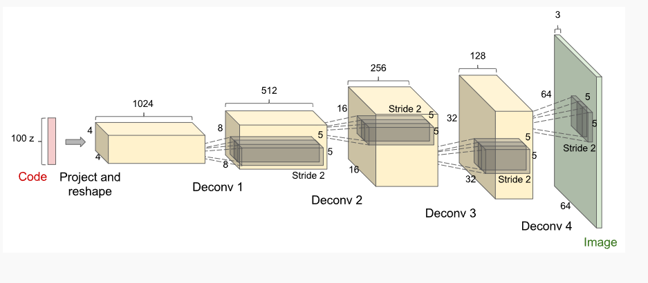 Một trong những mô hình gần đây như vậy là mạng DCGAN từ Radford et al. (hiển thị bên dưới). Mạng này lấy 100 số ngẫu nhiên được rút ra từ một phân phối đồng đều làm đầu vào (chúng tôi gọi những thứ này là mã hoặc biến tiềm ẩn , màu đỏ) và đưa ra hình ảnh (trong trường hợp này là hình ảnh 64x64x3 ở bên phải, màu xanh lá cây). Khi mã được thay đổi theo từng bước, hình ảnh được tạo ra cũng vậy—điều này cho thấy mô hình đã học được các tính năng để mô tả thế giới trông như thế nào, thay vì chỉ ghi nhớ một số ví dụ.
