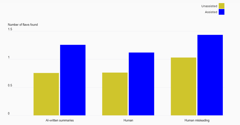 Mặc dù tóm tắt thực sự không phải là một nhiệm vụ khó khăn đối với con người và các mô hình của chúng tôi không có khả năng hơn con người, nhưng chúng đã cung cấp sự hỗ trợ có ý nghĩa: khi được yêu cầu đánh giá các bản tóm tắt do mô hình viết, nhóm được hỗ trợ tìm thấy nhiều hơn 50% lỗi so với nhóm đối chứng. Đối với các bản tóm tắt cố tình gây hiểu lầm, sự hỗ trợ làm tăng tần suất con người phát hiện ra lỗi cố ý từ 27% lên 45%.