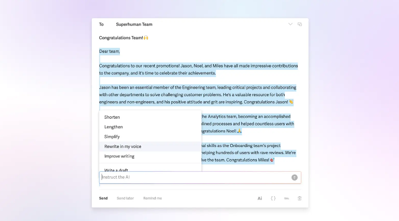 Superhuman đang tiến triển nhanh chóng trên Superhuman AI, được hỗ trợ bởi API của OpenAI. Họ đã tung ra một số lượng lớn các tính năng do GPT điều khiển như: