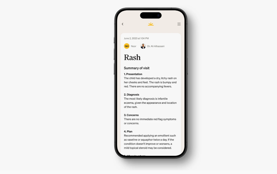 Summer Health cung cấp cho cha mẹ quyền truy cập vào dịch vụ chăm sóc nhi khoa nhanh chóng, đáng tin cậy vào bất kỳ thời điểm nào trong ngày (hoặc đêm), tất cả thông qua tin nhắn văn bản. Tuy nhiên, như bất kỳ cha mẹ hoặc bác sĩ nào cũng biết, dịch vụ chăm sóc y tế không kết thúc khi chuyến thăm kết thúc. Đó là nơi ghi chú về chuyến thăm khám y tế phát huy tác dụng, ghi lại những gì đã thảo luận, kế hoạch chăm sóc là gì và bất kỳ cuộc theo dõi cần thiết nào.