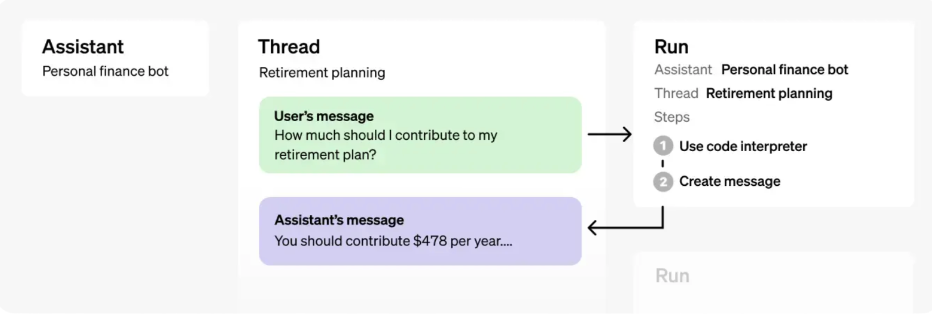 Assistants, bao gồm một mô hình cơ sở, hướng dẫn, công cụ và tài liệu (bối cảnh),Threads, biểu thị trạng thái của một cuộc trò chuyện vàRuns, cung cấp năng lượng cho việc thực hiệnAssistanttrên aThread, bao gồm phản hồi bằng văn bản và sử dụng công cụ nhiều bước.