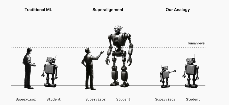 Một phép loại suy đơn giản cho siêu căn chỉnh: Trong học máy (ML) truyền thống, con người giám sát các hệ thống AI yếu hơn mình (bên trái). Để căn chỉnh siêu trí tuệ, thay vào đó, con người sẽ cần giám sát các hệ thống AI thông minh hơn mình (ở giữa). Chúng ta không thể trực tiếp nghiên cứu vấn đề này ngày nay, nhưng chúng ta có thể nghiên cứu một phép loại suy đơn giản: các mô hình nhỏ có thể giám sát các mô hình lớn hơn (bên phải) không?