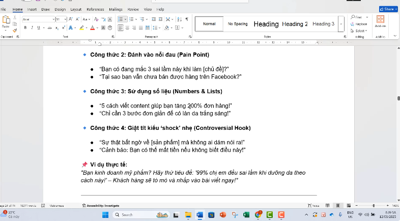 Về công thức viết tiêu đà giật tiết thì chúng ta phải đặt câu hỏi là thế tại sao tiêu đề lại quan trọng đến như vậy, 80% người đọc chỉ đọc tiêu đề trước, khi đọc tiêu đề xong rồi mới có 20% tỷ lệ người đọc tiếp nội dung về phần tiêu đề hấp dẫn thì tăng tỷ lệ đọc cộng với tăng tỷ lệ chia sẻ tăng tỷ lệ chốt đơn. Nên cái công thức giật tít hiệu quả thì anh chị có thể sử dụng những công thức như sau. Công thức số 1 gây sự tò mò ví dụ như là anh chị phải ghi vào để áp dụng, không phải học rồi quên hết phải ghi vào các công thức này rất quan trọng trong quá trình viết nội dung đây là công thức đầu tiên là gây sự tò mò. Ví dụ như đừng mua cộng với tiên sản phẩm sản phẩm anh chị có thể thay bằng bất kỳ cái sản phẩm nào anh chị bán mỹ phẩm nước hoa hay là cái gì đấy công thức là đừng mua cộng với sản phẩm cộng với là gì nếu chưa đọc bài viết này. Công thức thứ 2 là gì đánh vào nỗi đau của bạn có đang mắc 3 sai lầm này khi làm cộng chủ đề ví dụ như là bạn có đang mắc 3 sai lầm này khi làm đẹp da hay là khi là vút tóc hay không cộng với chủ đề tại sao bạn vẫn chưa bán được hàng trên facebook tại sao bạn vẫn chưa có một làn da đẹp tại sao bạn vẫn còn hôi khách tại sao bạn vẫn còn hôi miệng đấy là công thức đánh vào nỗi đau cái này anh chị phải ghi lại rất ngắn phải cầm cái bút ghi lại công thức để khi chúng ta viết bài chúng ta sẽ viết tùy chỉnh theo những công thức này cho nó hợp lý. Công thức số 3 là công thức sử dụng số liệu number and list, 5 cách viết content để giúp bạn tăng 200% đơn hẳn list là lịch kê số liệu chỉ cần 3 bước đơn giản để có làn da trắng sáng đấy công thức số 3 là sử dụng số liệu.